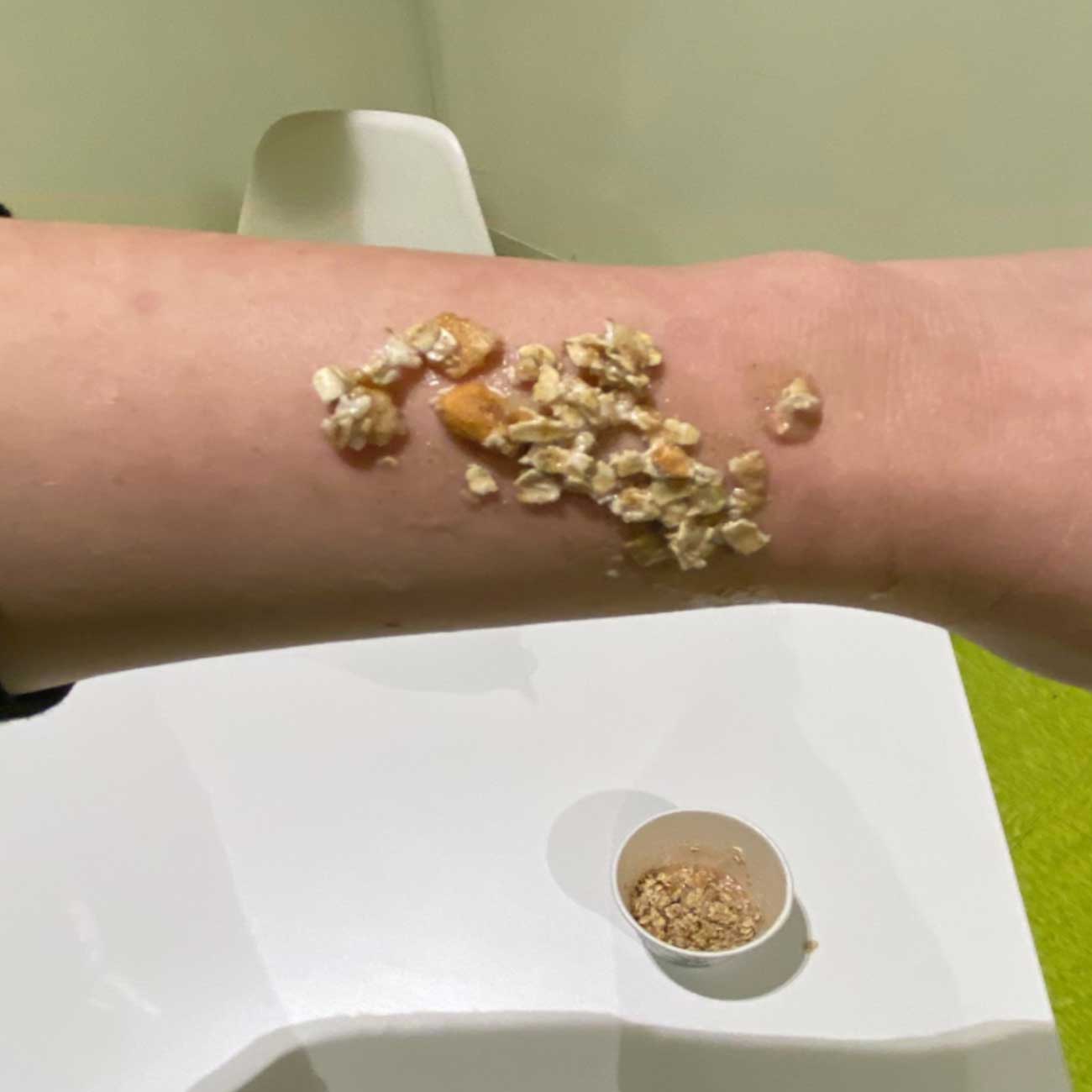 We are going to pretend we have leprosy and that Jesus heals us! Do you have oatmeal or flour at home? Great! We will use that for this project. You want to use one part water and two parts oatmeal or flour. I used oatmeal. You want it to be sticky. Put it on your arm and pretend you have leprosy! Feel free to put as much or as little as you want. When you wipe it off, practice saying “Thank you” to Jesus!
