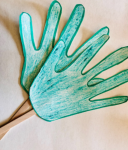 Trace your hand, cut it out, and tape it to the stick. If you want to make your palm branch really big, cut out a lot of traced hands! If your little ones are learning to write, lightly write the word “HOSANNA” on the branch and have your little one trace it! 🙂